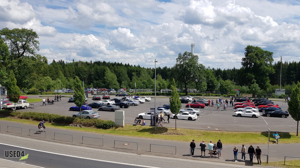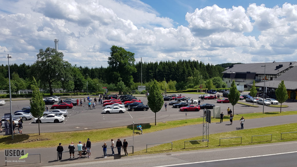 Während also am Donnerstag die Anreise und Freitag eine Ausfahrt bei bestem Wetter und in vielerlei Fall mit offenem Targadach stattfanden, so war der für die Öffentlichkeit frei zugängliche Höhepunkt für Samstag gesetzt: alle Fahrzeuge wurden auf dem angemieteten Parkplatz gegenüber des ringwerk°, direkt am Eingang zum Nürburgring, präsentiert. Von völlig originalen, seltenen Modellen, über komplett umgebaut,