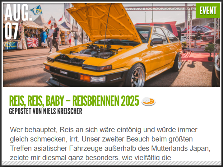 Nicht am Fuji, sondern auf dem Lausitzring findet das Reisbrennen statt, ein Treffen asiatischer Fahrzeuge epischen Umfangs. Mein Bericht darĂŒber ging am 7. August online: