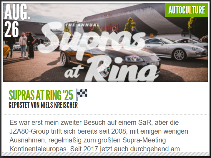 Mein zweites Supras at Ring (SaR) ĂŒberhaupt und ein richtiges Highlight in diesem Jahr. Das Gruppenfoto auf der Grand Prix-Strecke des NĂŒrburgrings hat sich in mein GedĂ€chtnis eingebrannt: