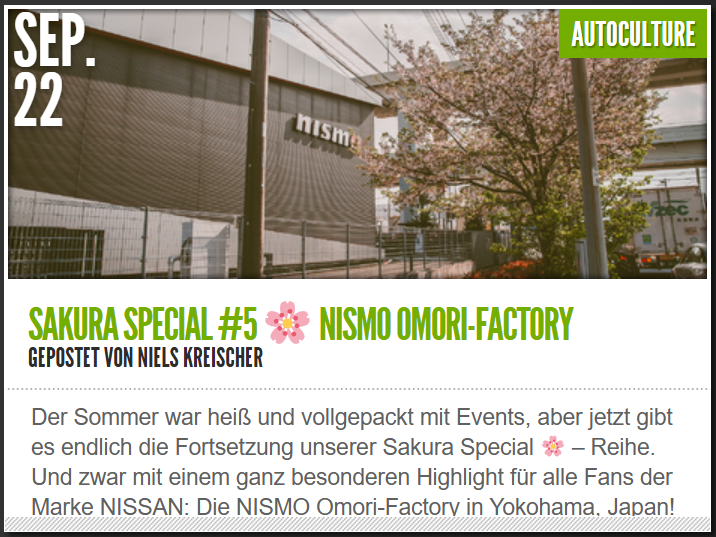 Nur eine Woche spĂ€ter ging das nĂ€chste Sakura Special đž online: #5 NISMO und die Omori-Factory. Besonders fĂŒr NISSAN-Fans (wie mich selbst) ein Schmankerl: