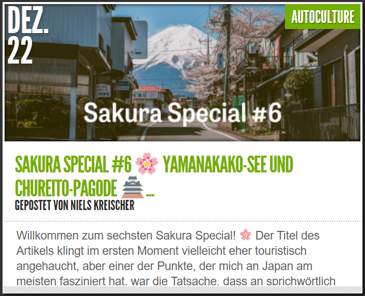 Der letzte Artikel im vergangenen Jahr gehörte wieder der Sakura Special đž – Reihe: Ausgabe #5 ĂŒber die wahnsinnig schöne Gegend rund um den Fuji und den Yamanakako-See: