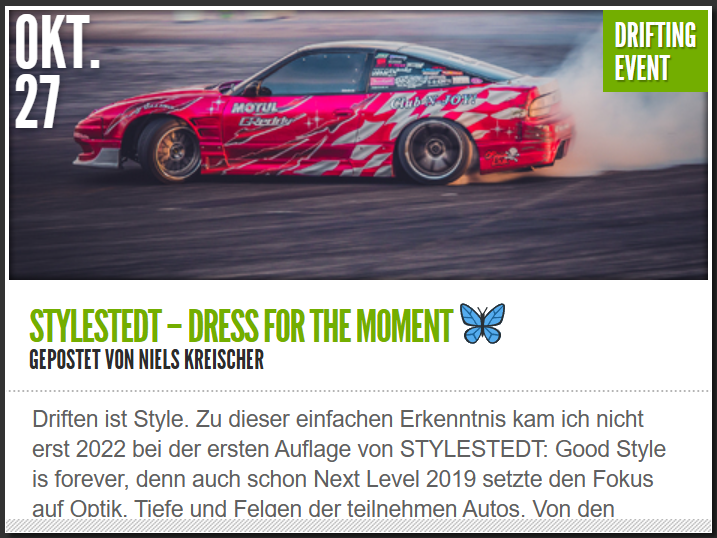 So auch beim STYLESTEDT ’25, das fĂŒr mich trotz der KĂ€lte ein inneres BlumenpflĂŒcken war, denn egal ob Stance wie beim S-FEST oder Drift wie beim SXOC: der Style ist fĂŒr mich mit das Wichtigste beim Auto.