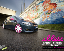 Was wäre, wenn die Welt sich Grau in Grau entwickeln würde, ein Jeder würde es dem Anderen gleichtun und die Erde wäre voller Dinge die JEDEM gefallen? Die „Hater“ hätten nichts zu beschimpfen, sämtliche Emotionen würden absterben und unsere Welt würde eingehen. Zum Glück gibt es aber Leute wie Philip! Bereit, sich Trends aus Japan und der USA zu widmen. Weg vom aktuellen JDM Trend hin zum Flushness Look! Nach seinem Lexus IS, kam ihm die Idee zu einem Toyota Auris-Umbau eines Freundes. Toyota Auris? Richtig gelesen! Um genau zu sein: Ein Toyota Auris mit Diesel Triebwerk. Er sollte das Alltagsvehikel werden, nachdem der Toyota GT4 zu schade für die Nutzung als Daily wurde. Gesagt, getan – Projekt gefasst. Zuerst wurde das Fahrzeug um ganze 85 cm heruntergeschraubt, um die richtige Flushness herzustellen. Die Felgenwahl gestaltete sich schwierig, sollten doch exotische Exemplare den Auris zieren. Da sich auf dem Lexus schon ebensolche Felgen aus den USA befanden, musste der Auris logischerweise einen anderen Weg gehen…immerhin ist er ein waschechter Europäer….was also nun? Bentley? Mercedes? Porsche? Oder gar noch exotischer? Da es ohnehin geplant war, den Felgen ein mehrfarbigen Look zu verpassen, entschied man sich kurzerhand für diesen Zweck ideal geeignete Maybach Felgen in der Größe 8Jx19 . Lackiert wurden sie in Weiß-Pink, das für den außenstehenden Betrachter während der Fahrt, dank der Flächenunterschiede von Weiß zu Pink, harmonisch verläuft. Wie konnte man den Auris also noch verändern? Der europäische Tunermarkt ist definitiv nicht üppig für dieses Fahrzeug und auch ein Zurückgreifen auf gute japanische oder amerikanische Teile war nicht wirklich möglich. In guter alter DIY-Manier wurde deshalb kurzerhand zum Brenner gegriffen, die Motorhaube geflammt und danach versiegelt. Als besonderes Highlight verstecken sich auf der Haube ein Illest Symbol und diverse Sterne, um sie auch...